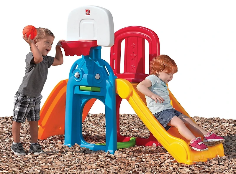 Tiny athletes are sure to have a blast as they climb, dunk, slide, kick and crawl with the Game Time Sports Climber by Step2. Youngsters can shoot some hoops with the built-in basket, kick a goal through the crawl through space and tally up the points with the score board. Kiddos will develop their gross motor skills by climbing up the ladder and sliding down the slide. The active play fun never ends with the Game Time Sports Climber! Made in USA of US and imported parts. Sports ball made in China.