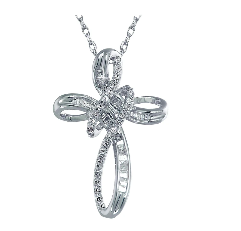 Swirls lined with diamonds enliven this contemporary sterling silver cross necklace for her. The pendant has a total diamond weight of .30ctw and sways from an 18' chain that secures with a spring clasp