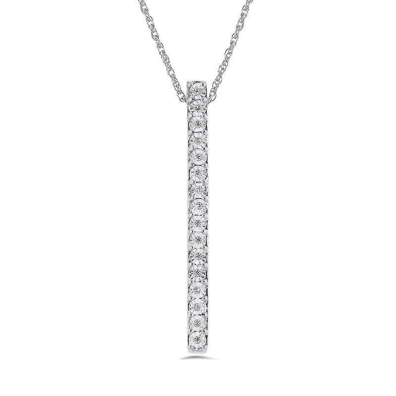 Captivate with this modern classic designed by Bella Moda- this line pendant features a sparkling 0.04ctw of round diamonds artfully crafted in shimmering sterling silver. Suspended for an 18" rope chain, this piece is fantastic worn on its own or layered for a fashion forward look. Bella Moda - Beauty is always in fashion.