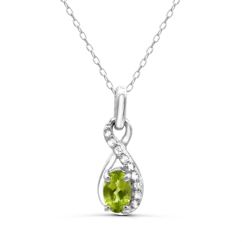 This modern yet classic, infinity design pendant is crafted in gleaming sterling silver and is sure to become a favourite item in your jewellery collection. This item is perfectly adorned with shimmering white topaz and an oval cut peridot, which is the birthstone for August. If you are looking for something stunning, order this for yourself or someone you love today!