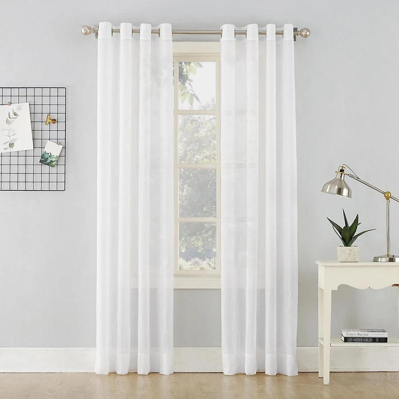 SUN TEXTILE crushed sheer voile curtain panel is a modern style voile that will enhance the appearance of any living space. Attractive grommets accommodate curtain rods up to 1.5 in diameter. Machine wash cold on gentle cycle. Use only non-chlorine bleach when needed. Tumble dry on low heat. Use a cool iron as needed.