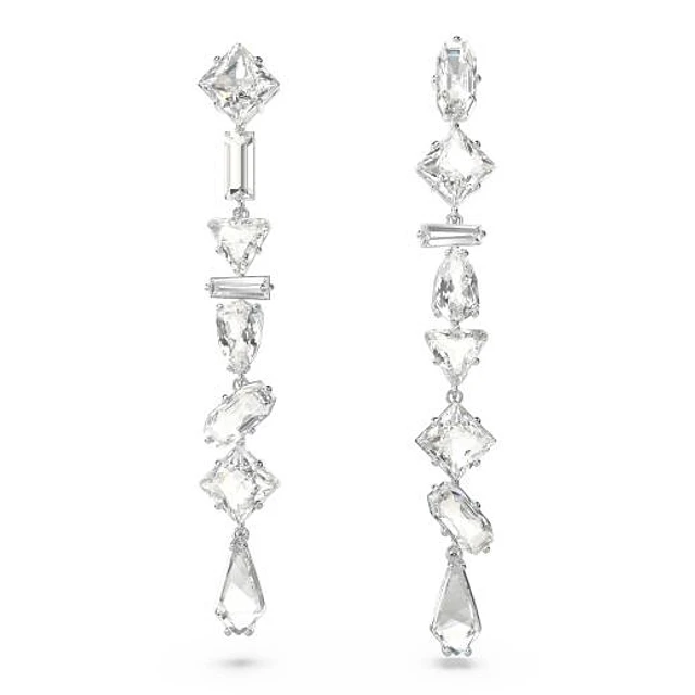 Mesmera drop earrings, Asymmetrical design, Mixed cuts, Long, White, Rhodium plated by SWAROVSKI