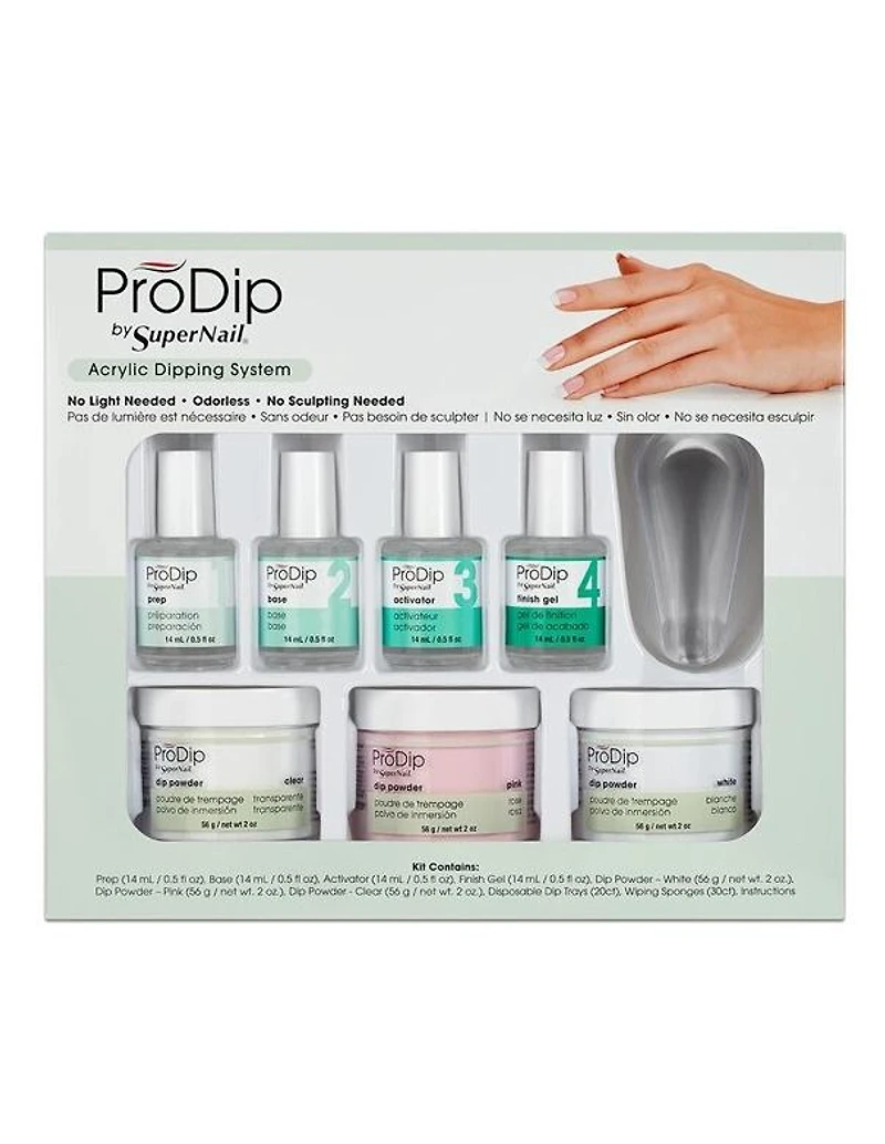 Système de trempage d'ongles SuperNail 7 pièces Supernail Prodip Créez de magnifiques ongles longue tenue en un rien de temps grâce au système ProDip de Supernail ! Ce système ultra-brillant est disponible en blanc, rose, transparent et 30 poudres colorées finement broyées. Des couleurs tendance audacieuses aux paillettes prismatiques, il existe une teinte ProDip parfaite pour toutes les envies ! Ce système de trempage professionnel vous fait gagner du temps sans sacrifier la qualité ni la régularité. Un limage minimal est nécessaire pour préparer vos ongles à l'application de la poudre. Inutile de sculpter ou de catalyser sous UV, ce qui évite d'endommager l'ongle naturel. Les poudres ProDip sont inodores et légères pour une application confortable et une tenue prolongée. ProDip peut être utilisé sur l'ensemble de l'ongle pour créer une protection contre les fissures et les fissures. Vos ongles naturels sont protégés et continuent de pousser en dessous. Le retrait de ProDip est facile et sans effort, avec un temps de trempage de 10 minutes. Caractéristiques Crée des ongles légers et d'apparence naturelle Aucune sculpture nécessaire Dépôt minimal Processus de retrait de 10 minutes Aucune lumière UV nécessaire pour durcir Peut être utilisé sur l'ongle entier ou pour réparer les fissures et les fentes Les ongles naturels deviennent plus forts en dessous Inodore Le kit contient : 1 x Préparation (14 ml) 1 x Base (14 ml) 1 x Activateur (14 ml) 1 x Gel de finition (14 ml) 1 x Poudre de trempage - Blanc (56 g) 1 x Poudre de trempage - Rose (56 g) 1 x Poudre de trempage - Transparente (56 g) 20 plateaux à trempette jetables 30 éponges d'essuyage