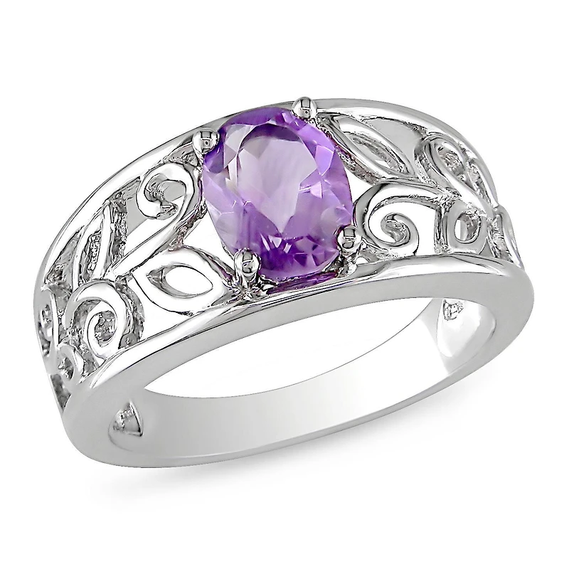 This stunning Tangelo ring is crafted in lustrous sterling silver and features an oval-cut (8x6mm) amethyst gemstone. This floral designed ring is enhanced with a high polish finish.Tangelo Jewellery: A rainbow of gemstones is yours to discover with Tangelo. With thousands of styles from classic to trendy, you'll find the hue that's right for you. Adorn yourself with a burst of color from a gemstone. For every occasion in your colorful life.