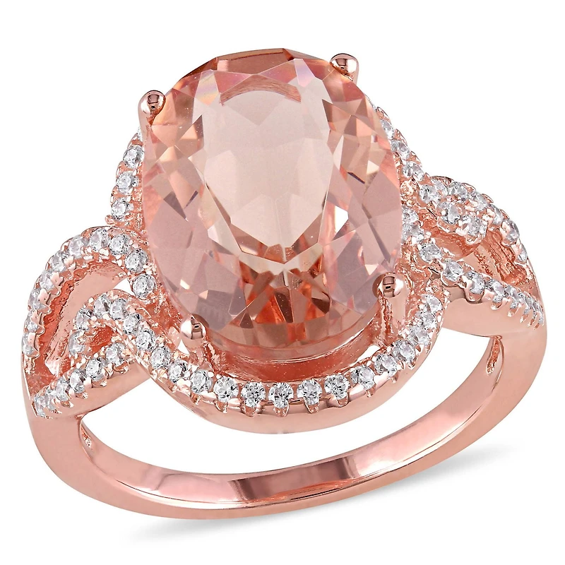 This Tangelo Halo cocktail Ring is crafted in rose rhodium-plated sterling silver and features an oval-cut (14x10mm) simulated morganite with round-cut (1mm) cubic zirconia gemstones set as a halo and along the band. This ring is enhanced with a high polish finish. Tangelo Jewellery: A rainbow of gemstones is yours to discover with Tangelo. With thousands of styles from classic to trendy, you'll find the hue that's right for you. Adorn yourself with a burst of color from a gemstone. For every occasion in your colorful life.