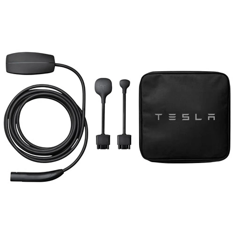 Mobile connector is designed for long trips and whenever extra range is needed Charge your Tesla up to three miles per hour with a standard outlet or up to 30 miles per hour using a 240V outlet Works with all Tesla electric vehicles with an adapter No installation is required when charging from a standard outlet, with the NEMA 5-15 adapter For fast charging use the NEMA 14‑50 adapter with a 240V outlet that delivers more range in less time (installation required) When paired with Powershare-equipped vehicles, the mobile connector can power electronic devices through the Powershare outlet adapter (Powershare is currently only available with Cybertruck) Includes one mobile connector with 20' cable, one NEMA 5-15 adapter, one NEMA 14-50 adapter, and one storage bag Check with your local and provincial governments for rebates, grants, or tax credits toward purchasing or installing a home EV charging station