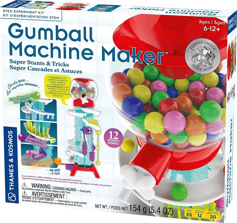 Super sweet stunts! Build your own gumball machines and learn physics lessons in the process. A turn of a handle dispenses one gumball at a time out of the clear storage globe and down the track. The gumballs land in a collection cup and can easily and sanitarily be returned to the globe for another run. The track segments can be moved around on the base to create an almost limitless number of different gumball machines. As the gumballs roll down the track, they perform cool stunts and tricks. Stunts include a pulley lift, pendulum, funnel, trampoline, variable-slope ramp, pinball launcher, and domino slide. Each segment of the track teaches a different lesson in mechanical physics, allowing users to explore topics including simple machines, force, motion, momentum, gravity, Newton’s laws, energy transfer, and more . Trial-and-error experiments teach in a fun, hands-on way: Will your gumball successfully make it to the end of the track, or will you have to reengineer your gumball machine to make it work? The kit works with standard machine-size, 16-mm (5/8-inch) gumballs and includes a small supply of gumballs to get started.