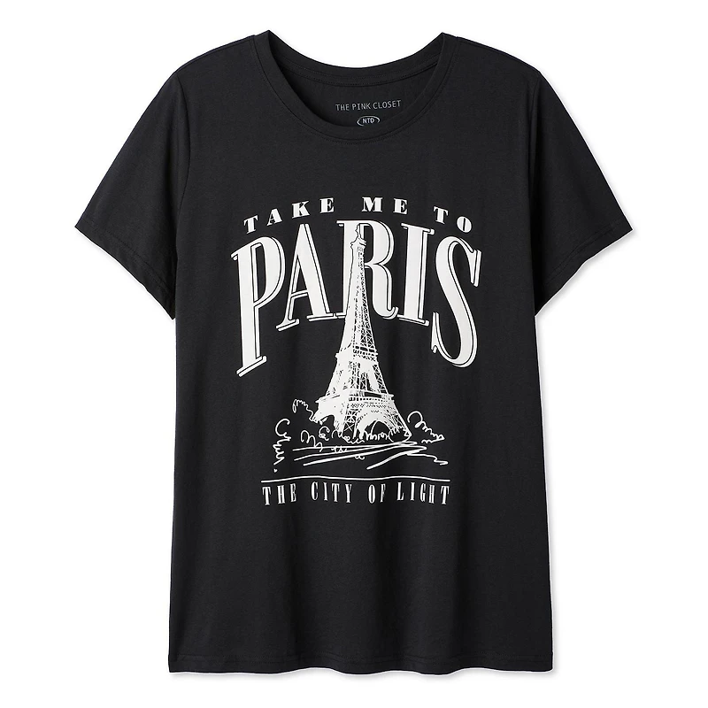 The Pink Closet women’s plus Paris T-shirt brings city-chic style to your everyday lineup. Made of soft jersey knit, it keeps you comfy whether you’re running errands, relaxing at home, or meeting up with friends. Designed with a classic crew neck, short sleeves, and a straight hem, it’s finished with a front Paris graphic print. Pair it with jeans, leggings, or joggers for a complete look.