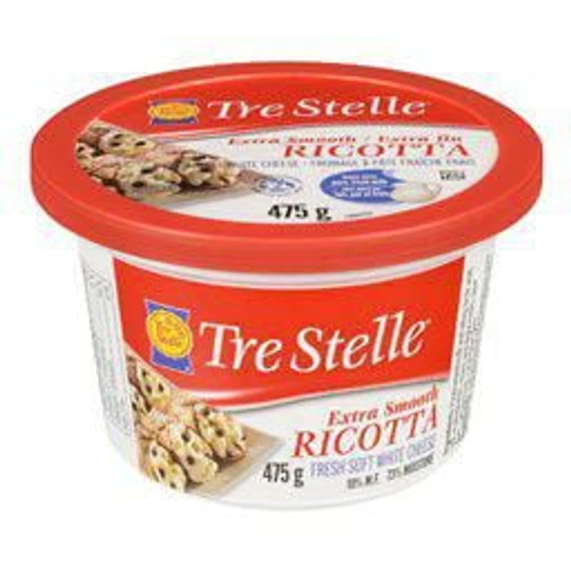 Tre Stelle Ricotta is a soft and moist fresh cheese with a mild and slightly sweet milky taste. Its creamy texture and low fat make Tre Stelle Ricotta excellent for both cooking and baking. It is a great source of protein and calcium and low in fat.