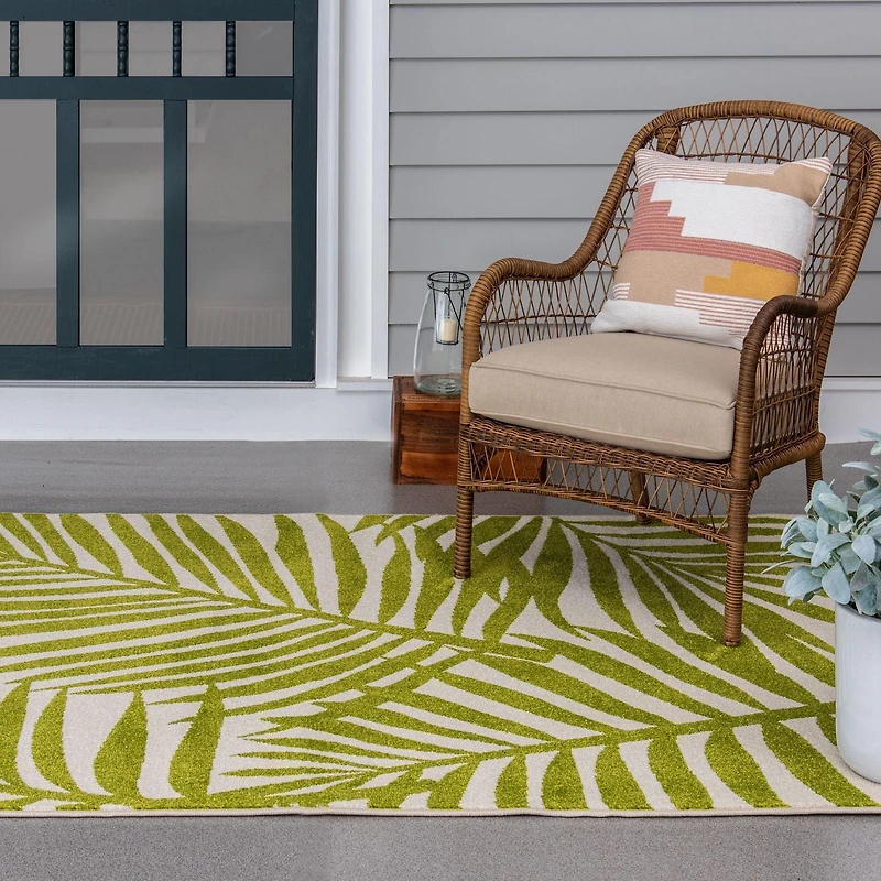 This bright, durable area rug is a ray of sunshine for your back deck, den, or sunroom, transforming any area into your own tropical oasis. Featuring an oversized leaf design and vibrant shades of green and ivory, this beautiful rug will bring the fun feeling of bright summer days to your indoor or outdoor space all year long. Whether it’s a quiet spot in the shade or a sunny grilling area on the patio, this floor covering lets you infuse a bit of coastal contemporary style into even the busiest areas of your home without fear of staining or fading. These gorgeous floor coverings are fade resistant, stain resistant, and surprisingly comfortable underfoot thanks to soft polypropylene yarns, so you can spend more time enjoying your space with family and friends. Easy to clean and machine made using state-of-the-art, computer-driven looms, these rugs are sure to maintain their exceptional quality for years to come.
