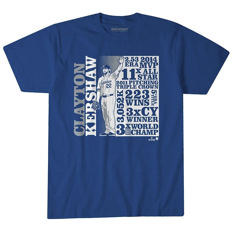 Wear the legacy of a Los Angeles Dodgers legend with this Clayton Kershaw GOAT List T-Shirt from BreakingT. Kershaw, a three-time Cy Young Award winner and World Series champion, has cemented his place among the greatest pitchers of all time. This stylish t-shirt pays homage to his remarkable achievements with screen-printed graphics listing his most memorable accomplishments. Crafted from a super-soft and durable cotton fabric, this tee is the perfect way for any fan to recognize Kershaw's rightful place on the GOAT list.