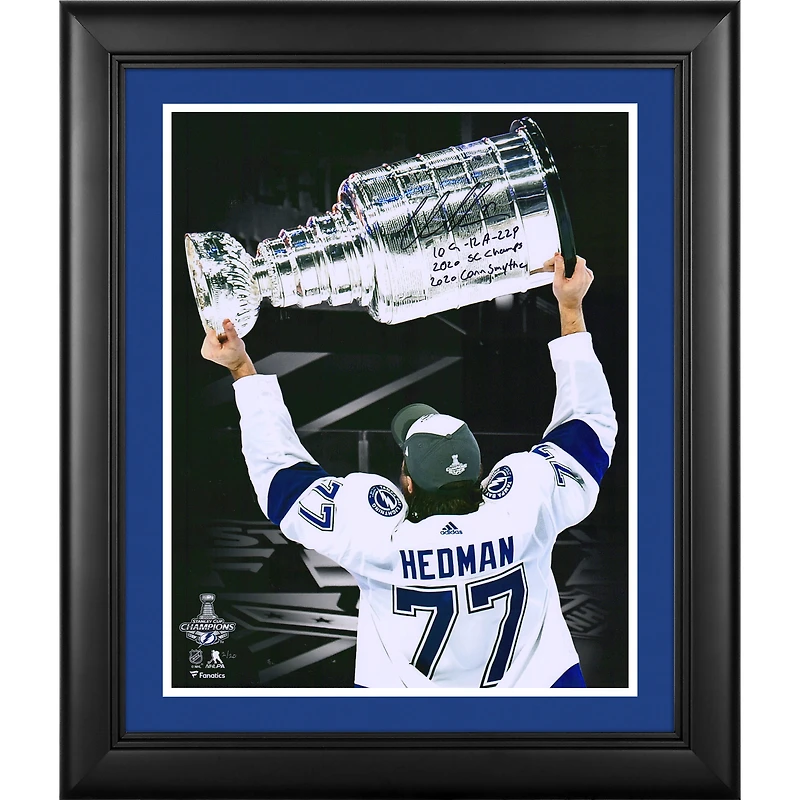 Display in your home or office an exciting Tampa Bay Lightning moment forever preserved with this Victor Hedman Framed 16" x 20" 2020 Stanley Cup Champions Raising Cup Spotlight Photograph - Limited Edition of 20. This cool photograph also includes the inscriptions "10 G-12 A-22 P", "2020 SC CHAMP", and "2020 Conn Smythe". As a conversation starter, it gives you a chance to relive that point in time and share your passion for Tampa Bay Lightning.