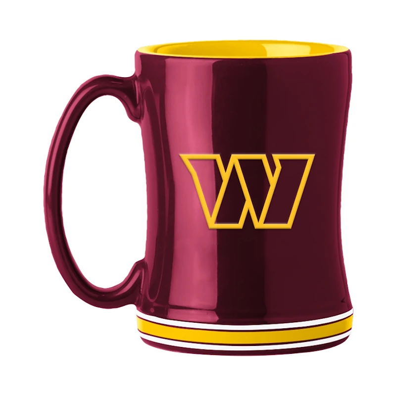 Enjoy this 14 oz. concave ceramic mug featuring your favorite team's colors. A 3-D raised logo adds extra detail, along with a stripe around the bottom. Team name appears on the handle.