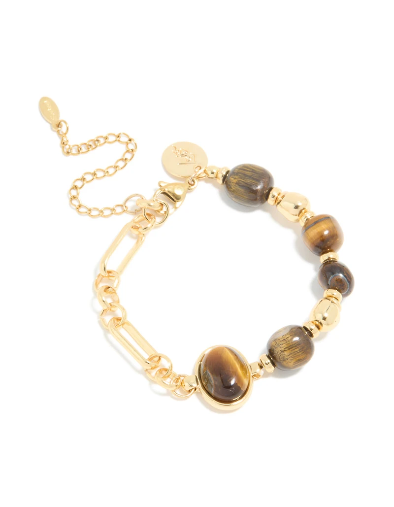 This Waterproof Gold Plated Stainless Steel Bead & Tigers Eye Semi Precious Stone Beads Bracelet is your new everyday hero. This stylish beaded bracelet mixes sleek stainless steel beads with rich brown Tiger’s Eye stones for a laid-back, earthy look. Perfect for the beach, the gym or brunch, it’s crafted from waterproof stainless steel, so it’s sweat, swim and shower proof. Wear this gold plated bracelet solo for a clean, minimal vibe or stack it with your favourite bangles and chain bracelets for a cool, layered wrist. Tiger’s Eye is often linked with courage, clarity and confidence, making this semi precious stone bracelet a meaningful gift and a versatile accessory you’ll reach for on repeat. Material: Gold Plated, Stainless Steel Colour: Gold, Brown Dimensions: Length: 13 cm Waterproof/Resistant: Waterproof pieces from this collection are crafted from stainless steel, meaning they're sweat, swim and shower proof!