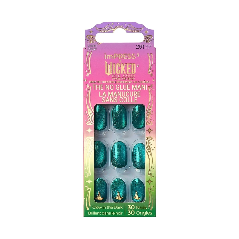 Splendiforous glow-in-the-dark green press on nails feature a magical magnetic powder effect & gold witch’s hat. Unleash your magic with the Easiest NO GLUE mani from Wicked x imPRESS Limited Edition Collection. NEW & IMPROVED adhesive for a secure hold that lasts for up to 10 days. From irresistible colors & designs to matte & glossy finishes, imPRESS X WICKED: FOR GOOD is always on trend with an exciting variety of styles, colors, shapes & sizes.