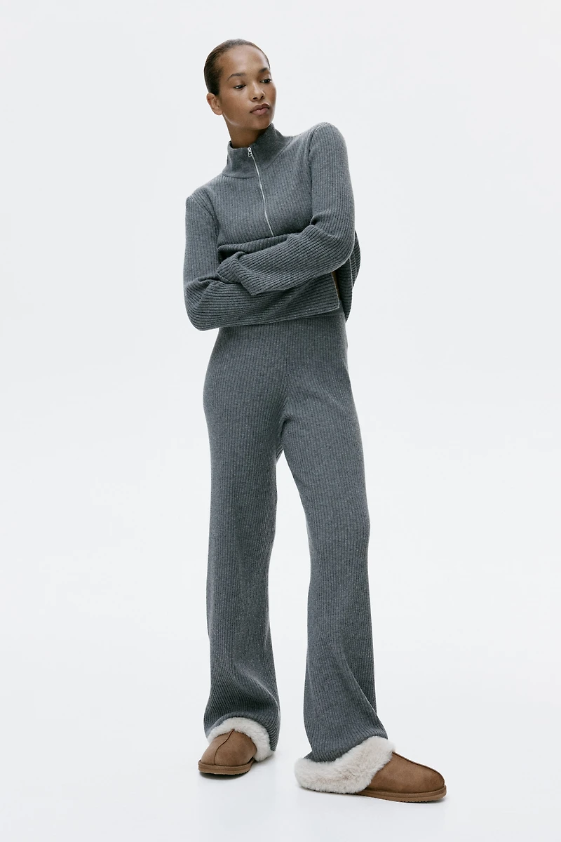 Soft, rib-knit pants. Elasticized waistband and wide legs.