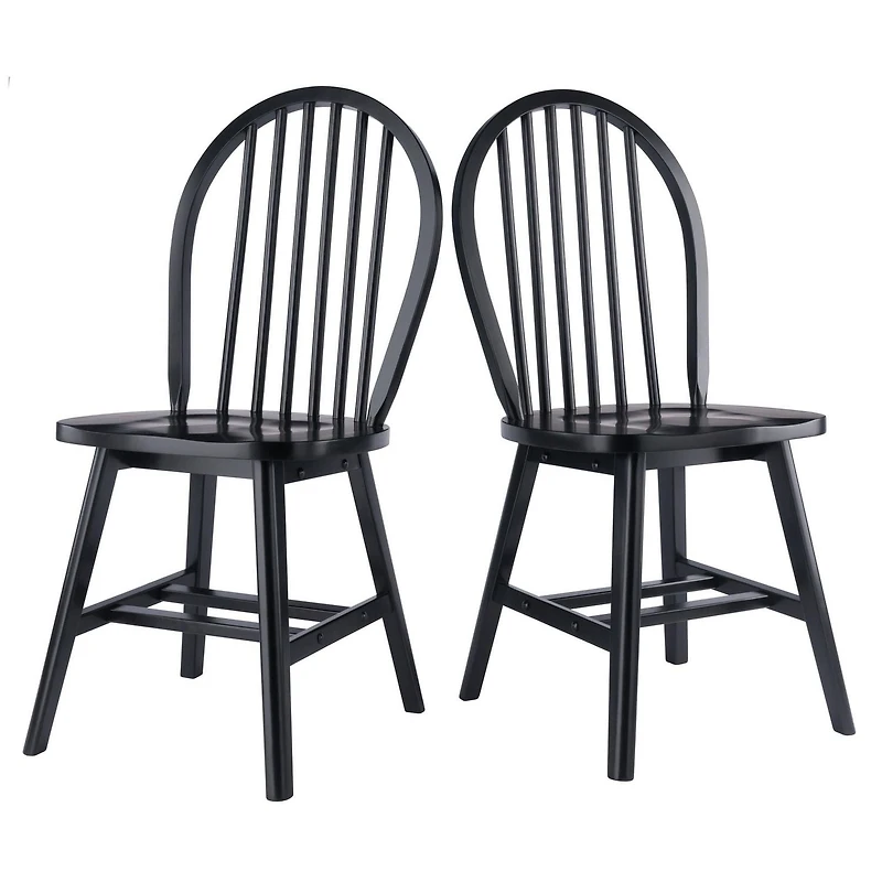 As early as the 16th century, English woodworkers began fashioning chair spindles in the same way they made wheel spokes, a design that became known as the Windsor Chair. This Winsome 2-piece set echoes that tradition. The 6-spindle arched back and the wide contoured seat offer the kind of support you want when lingering over dinner. The chairs are made of solid wood in a crisp black finish that will enliven your kitchen or dining area from contemporary to transitional decor. A double set of crossbars add durability and stability. Static weight capacity is 220 lbs. Conveniently ships in 1 box with all the hardware needed for assembly.