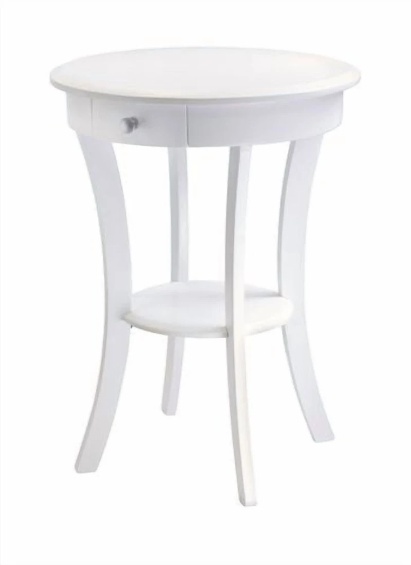 Elegantly simple end table. Its curved, smooth design blends well with any style of room decor. 20" Diameter solid wood top is large enough to hold a lamp floral vase etc. There is a drawer for storage and shelf for display. Drawer inside dimension 5.75"W x 7.87'D x 2.32"H. Shelf Diameter 11.81", Clearance from Bottom of Drawer to shelf is 12.40". Combination of solid and composite wood. Assembly Required