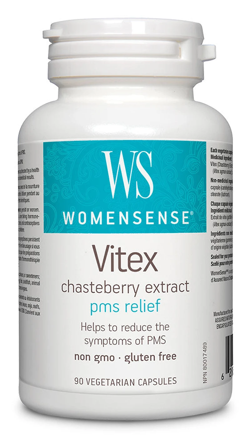PMS, Breast Tenderness, Cramps, Hormonal Acne, Irritability, Heavy MenstruationHormonal tonic for womenEffective Treatment For Female InfertilityIrregular Periods And OvulationMood Swings, Water RetentionDescriptionWOMENSENSE - Vitex - 90 Veggie Capsule(s) - NPN: 80017489 -- Vitex (Chasteberry) is an excellent hormonal tonic for women. Extensive clinical studies as well as over two thousand years of use have proven the effectiveness of this remedy. WomenSense Vitex Standardized Extract works by stimulating and normalizing the pituitary gland, which regulates the balance of estrogen and progesterone in the body. Vitex Standardized Extract from WomenSense is beneficial for: female infertility, PMS symptoms, breast tenderness, cramps, hormonal Acne and so much more!INGREDIENTS