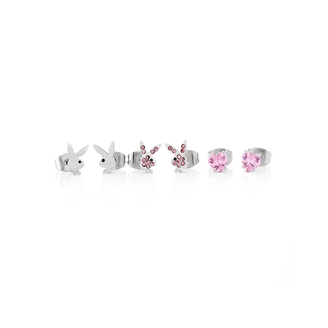 Multi-Pack CZ Pink Playboy Bunny Heart Stud Earrings 3 Pack - 20 Gauge