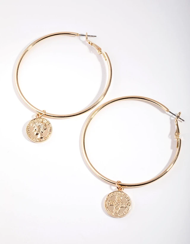 Gold Coin Drop Hoop Earrings