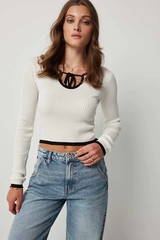 Ardene Two-Tone Keyhole Sweater in White | Size Large | Polyester/Rayon
